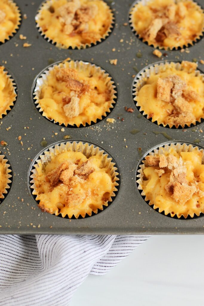 - Finally, divide and bake. Add the cheesy pasta to muffin liners. Be sure to fill it just under full so it doesn’t fall over the sides. Top with homemade breadcrumbs and bake to bubbly perfection!