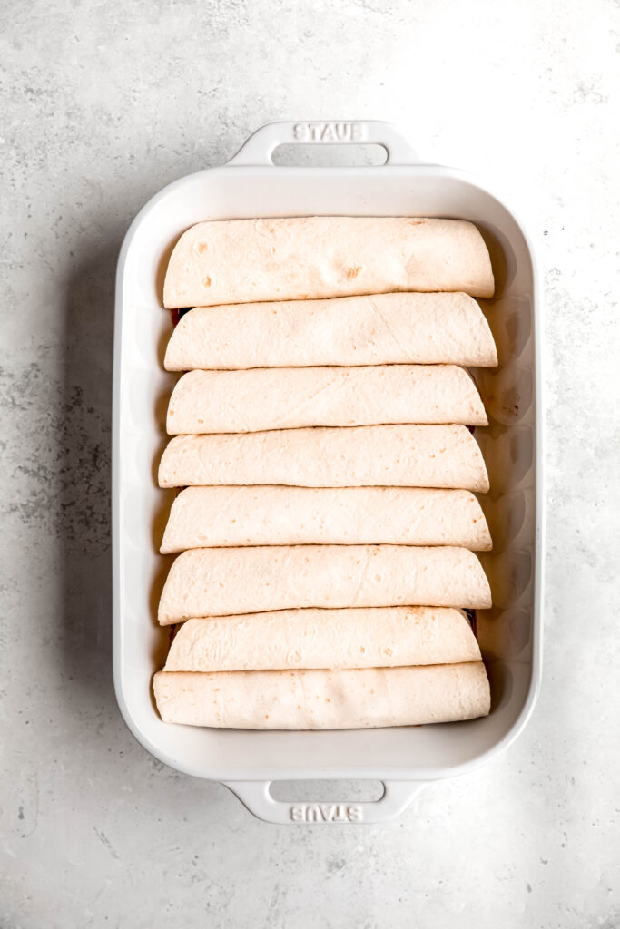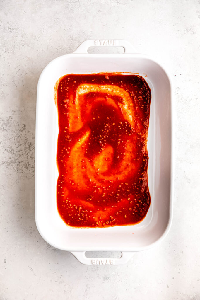 Set your oven to 375°F and lightly grease a 13×9-inch baking dish. Spread ¼ cup enchilada sauce across the bottom for extra flavor.