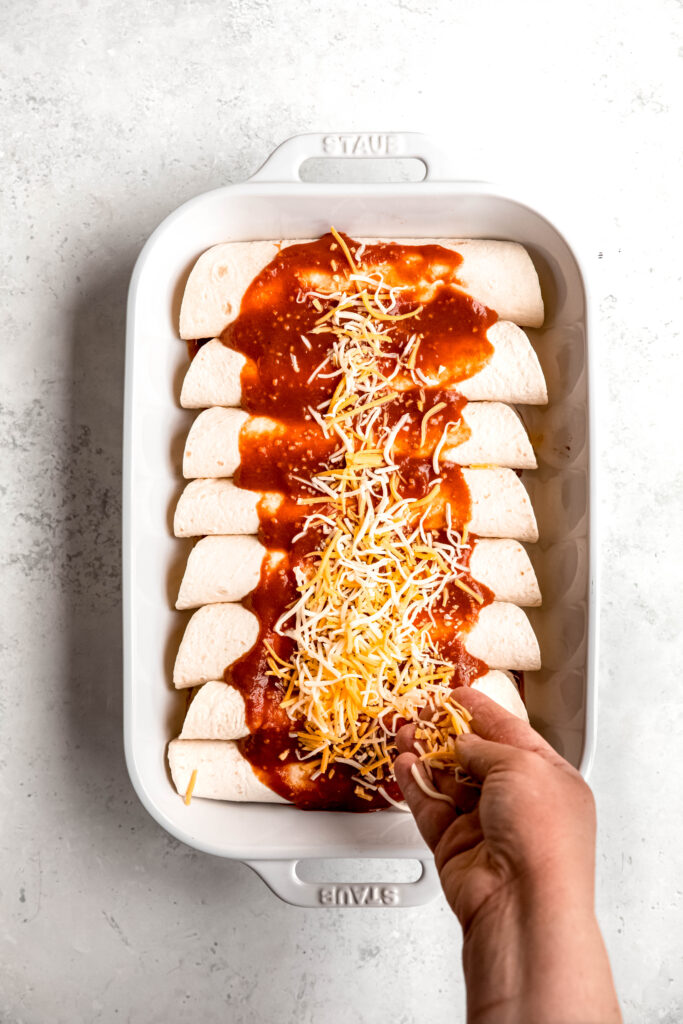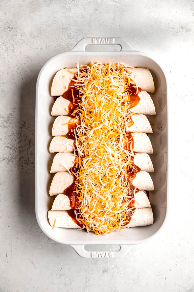 - Lay out the tortillas and evenly distribute the filling down the center of each (a little under 1/2 cup of filling per tortilla). Sprinkle with cheese (~2 T per tortilla), roll them up tightly, and place them seam-side down in the prepared baking dish.