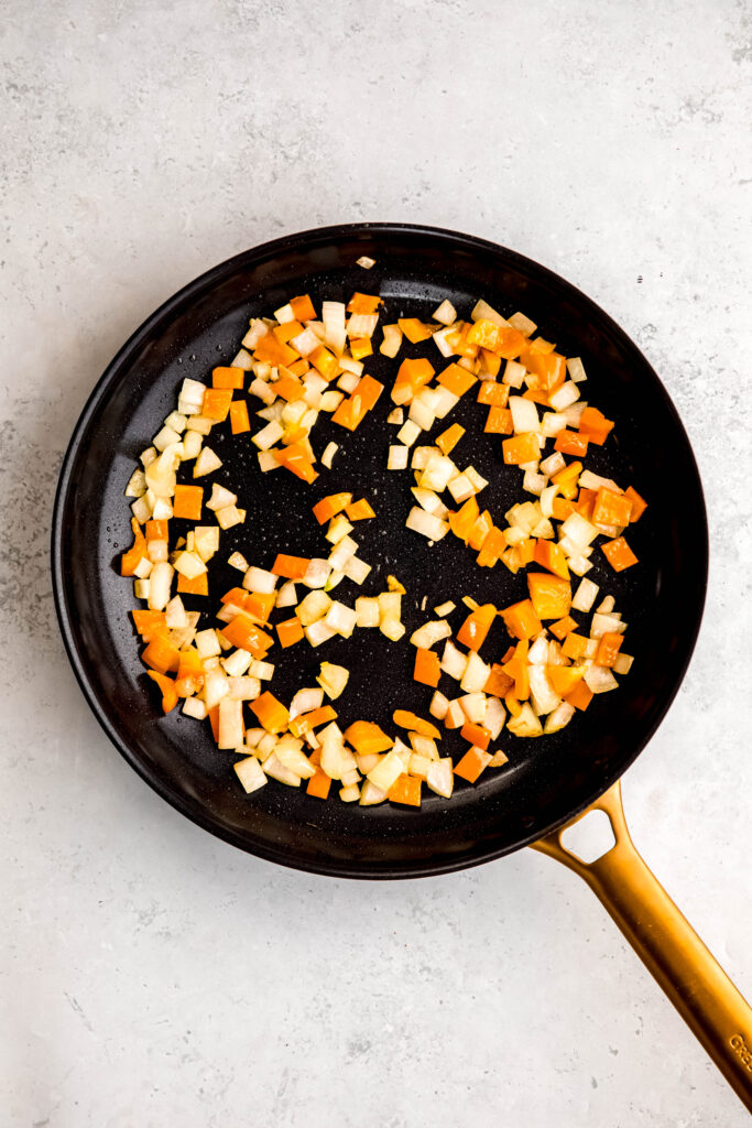 - Sauté the diced onion and pepper until softened and lightly browned, 3-5 minutes.