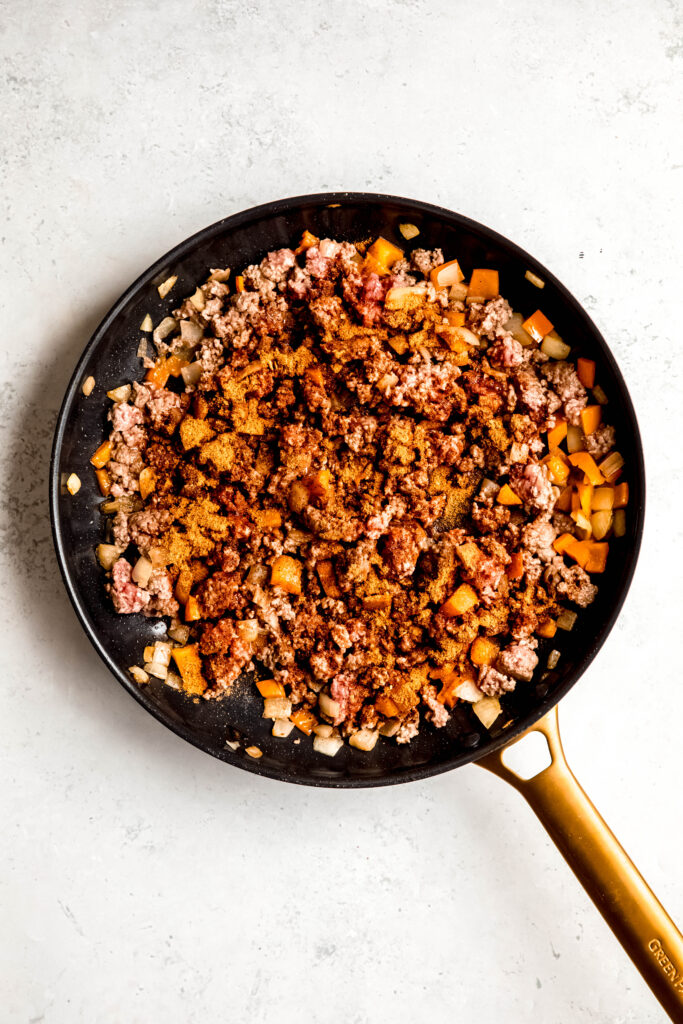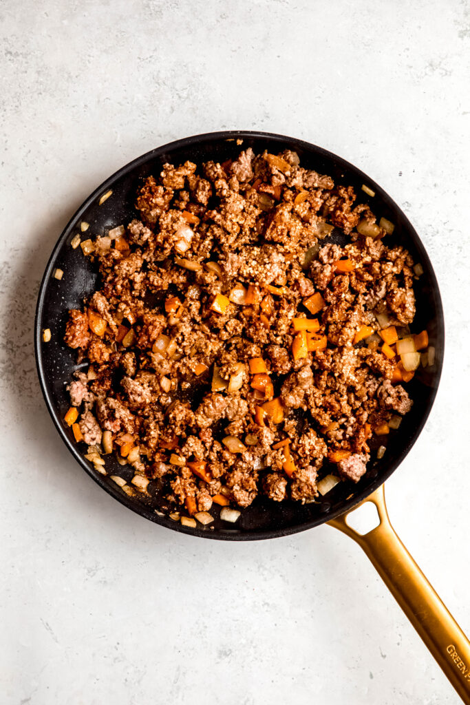 - To the same pan, add the protein of choice until browned and mostly cooked through. Then add minced garlic, taco seasoning, and stir in ½ cup of enchilada sauce.