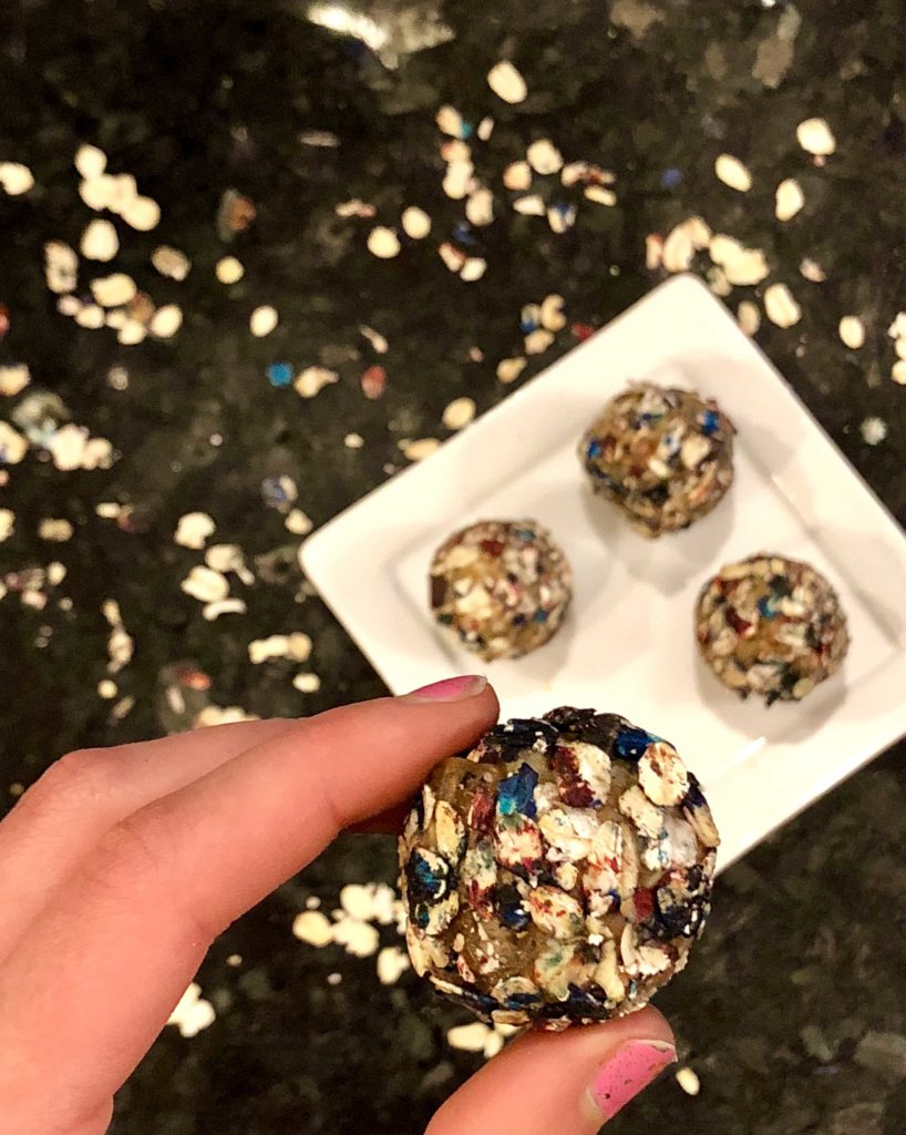 It’s easy to create create festive, colored bites for different holidays. Simply add 1/4 cup of coconut flour or oat flour into a bowl with 15-30 drops of food coloring and give it a stir. Try red and green food coloring for Christmas or red and blue for the Fourth of July. Then, simply roll your finished balls in the food-colored flour.