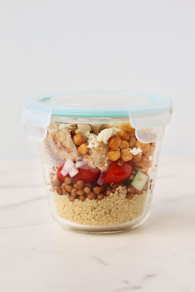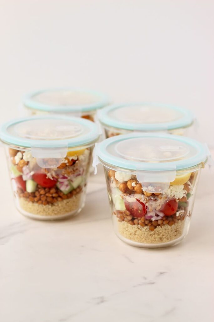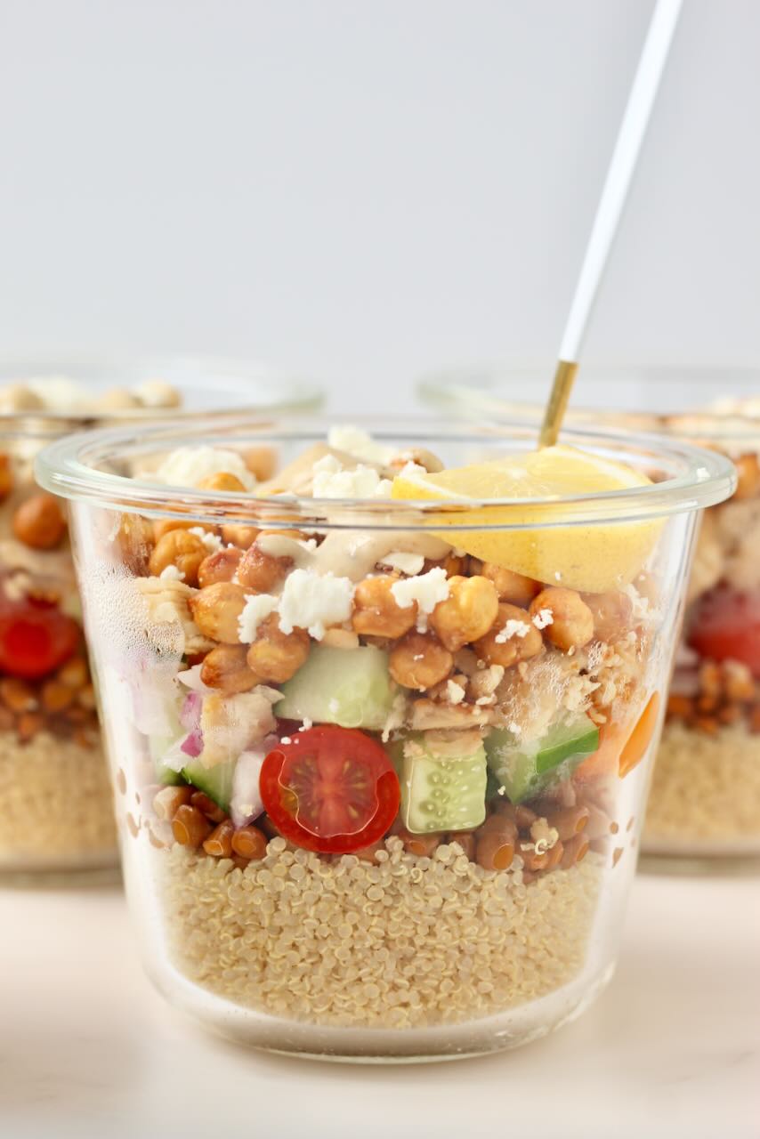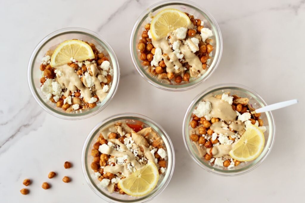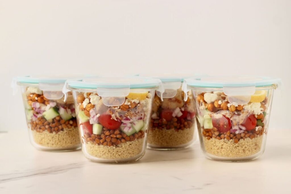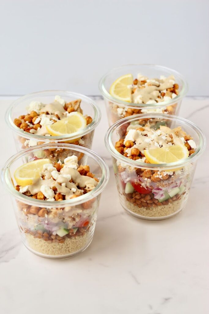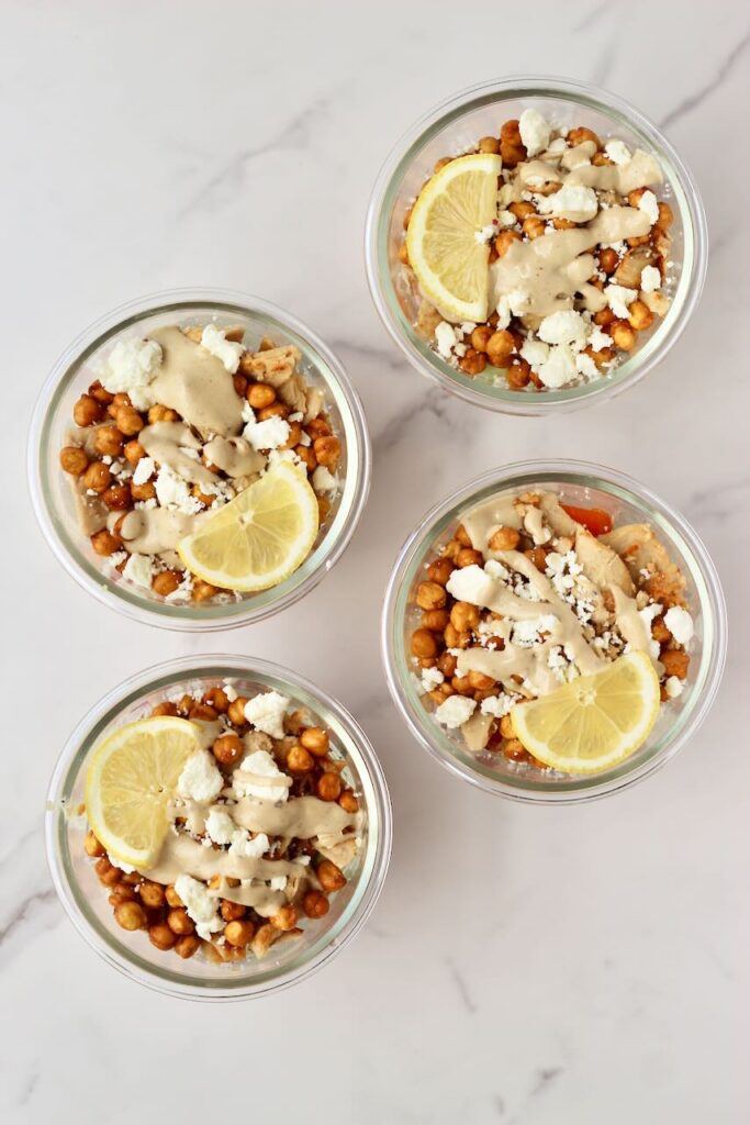 Distribute the quinoa, lentils, veggies, protein, feta, and chickpeas among 4 bowls. Don’t forget to tuck a lemon wedge into each one!