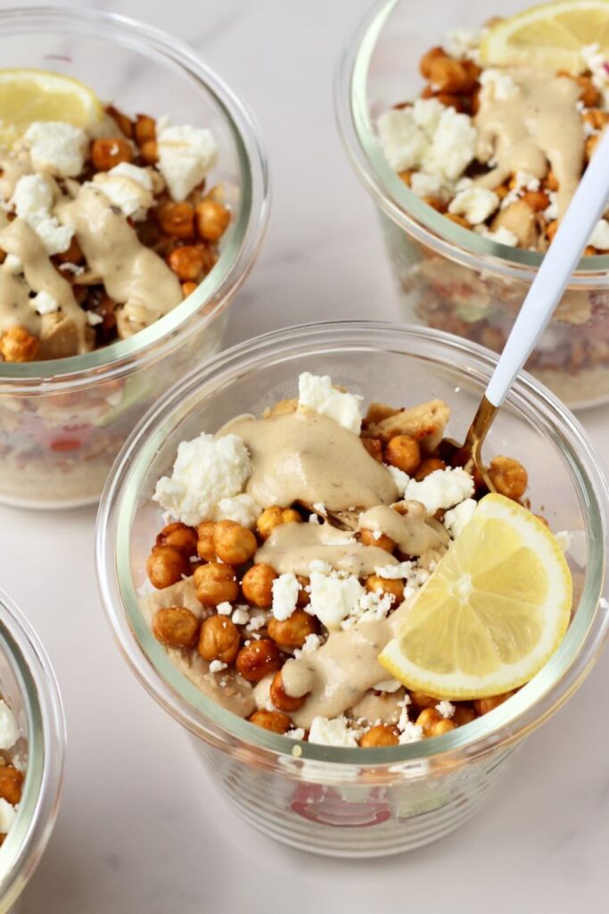 Make these bowls up to 5 days in advance and store in airtight containers. Keep dressing and crispy chickpeas separate until serving for best texture. Add your lemon wedge fresh before eating for that bright, zesty lift.