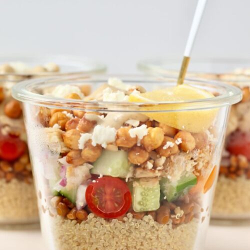 This fiber-packed Mediterranean grain bowl is fresh, flavorful, and perfect for meal prep. With quinoa, crispy chickpeas, and your choice of protein—like chicken, tofu, or salmon—it’s a satisfying lunch that keeps you full and energized.