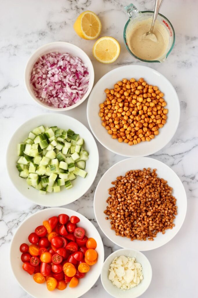 Ingredients for Mediterranean Grain Bowl in separate white bowls
