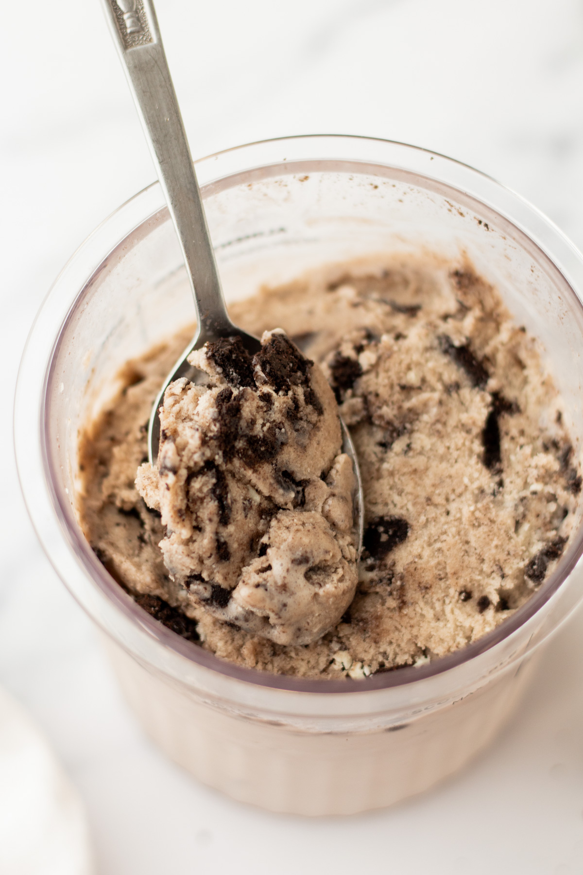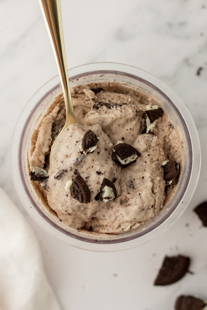 Want to level it up? Of course you do! Use a spoon or knife to make a small well in the center of the pint. Add in your favorite mix-ins (like crushed Oreos or rainbow sprinkles), along with another tablespoon of your base milk. Use the “Mix-In” setting to blend it all into creamy perfection.