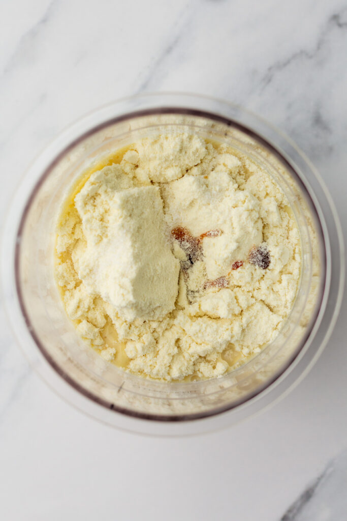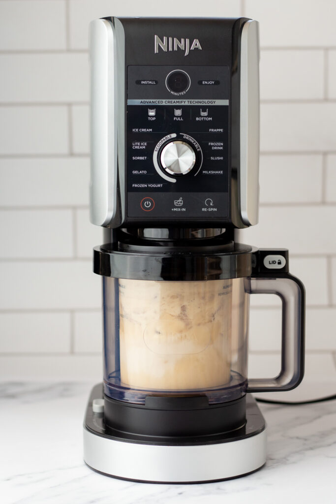 After freezing, run the pint through the “Lite Ice Cream” setting on your Ninja Creami. The texture will likely look crumbly or powdery at first—totally normal and expected!