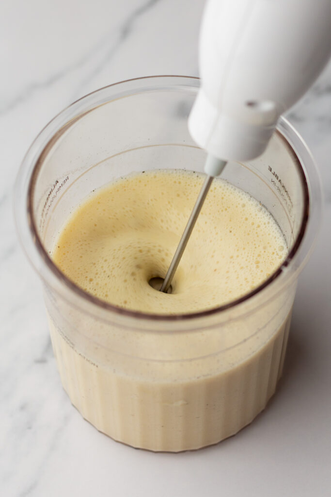 Add milk, protein powder, vanilla, and salt to your Ninja Creami pint. Stir well until fully smooth. A milk frother works wonders to break up any protein clumps and helps everything blend evenly.