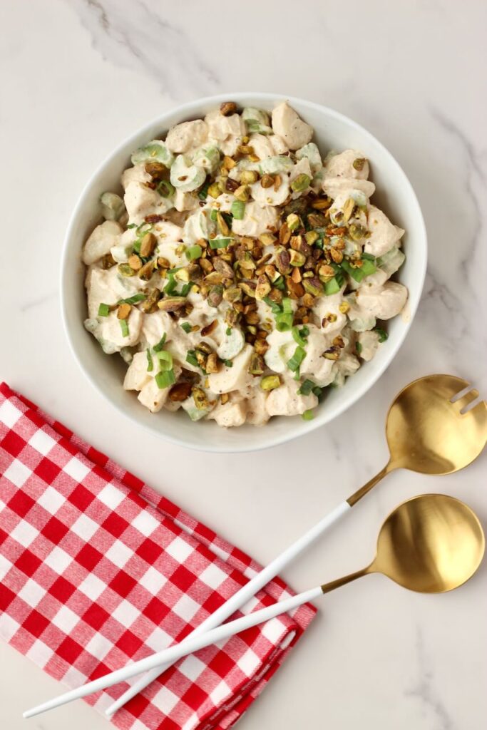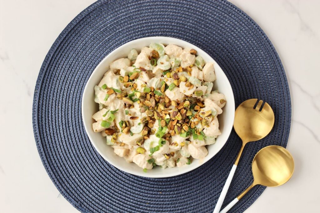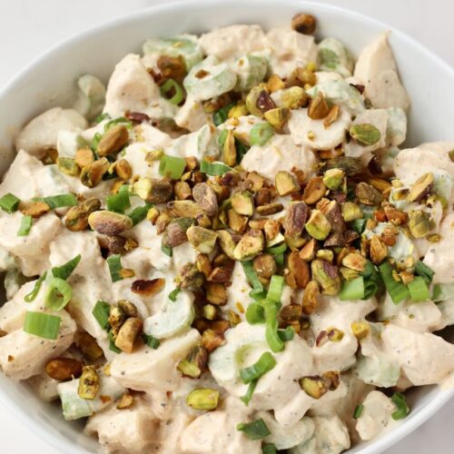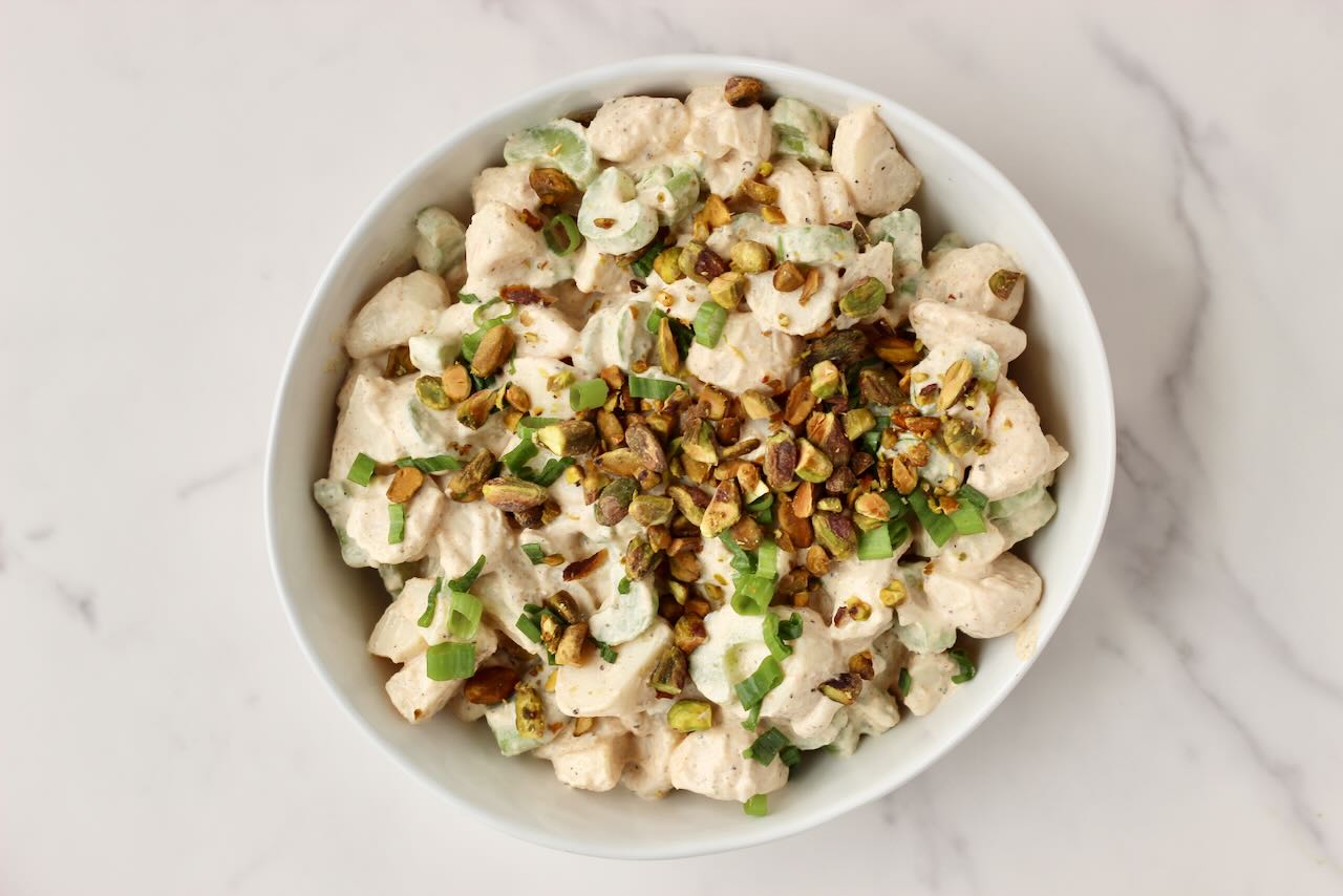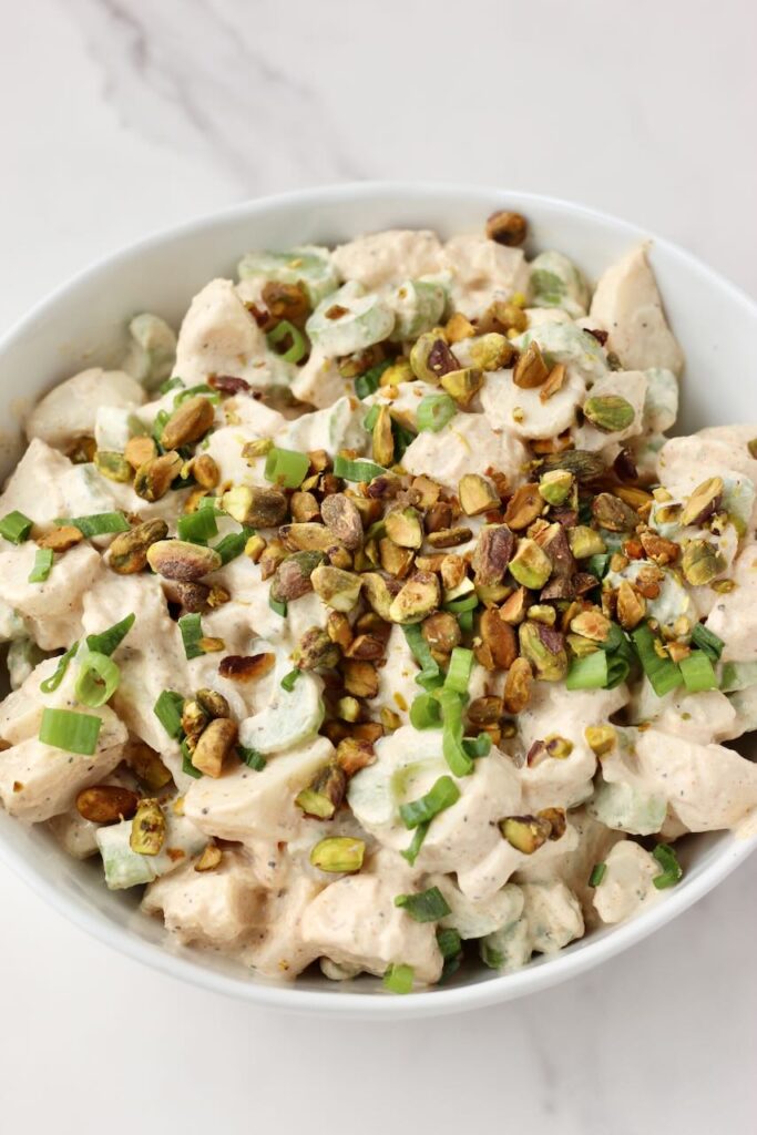 Just before serving, sprinkle the salad with green onions and chopped pistachios for added crunch and freshness.