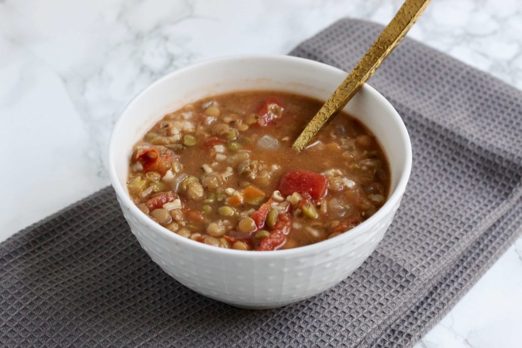 This Lentil Brown Rice Soup is the perfect, plant-based meal to serve on a chilly night. This dry soup mix also makes for a unique, affordable, and thoughtful holiday gift that friends and family will love! Free printable recipe card included! #souprecipes #drysoup #holidaygift #vegan #glutenfree