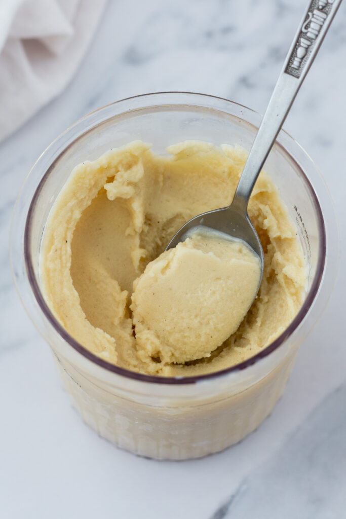 Flatten the surface with a spoon before popping your pint back into the freezer. It’ll keep for up to 2–3 months. If it hardens, you can either let it thaw for 20–25 minutes or microwave for 10–15 seconds before re-spinning or digging in.