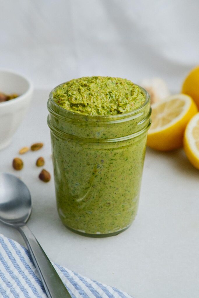 Shameless plug – my pistachio pesto is the BOMB! I honestly make it all the time to add to recipes like pasta salad, toast, as a dip with veggies, or the ultimate salmon topper.