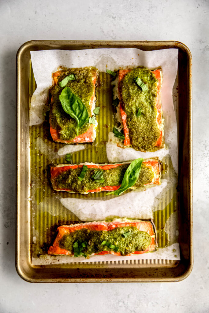 Spoon a generous layer of pesto over each piece of salmon. You may have leftover pesto—don’t toss it! It’s great on pasta, grain bowls, sandwiches or as a dip.
