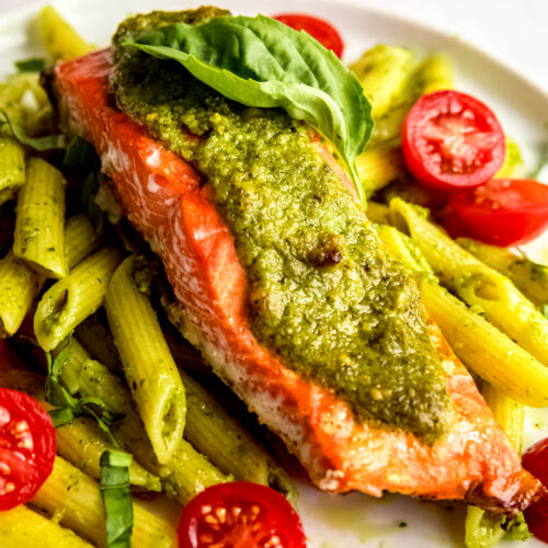 Yes, you can absolutely make this pesto salmon in the air fryer! Simply cook the pesto-topped salmon in your air fryer basket at 400°F for 8–10 minutes, or until it flakes easily with a fork and reaches an internal temperature of 135–140ºF.