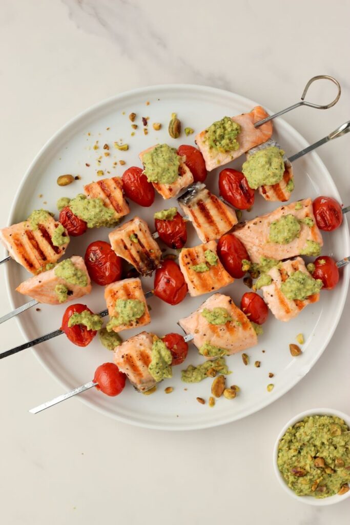 Looking for a fun way to serve this recipe for a party or 4th of July grill out? These pesto salmon skewers are a colorful and heart-healthy option! Here’s how to make them.