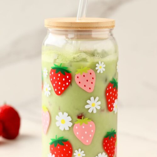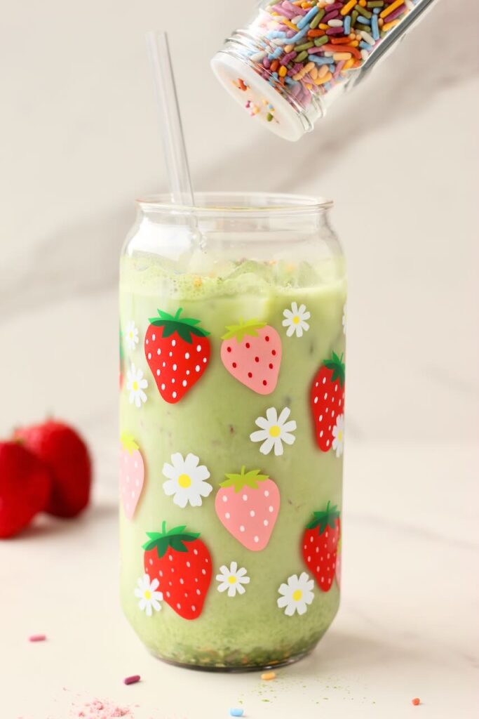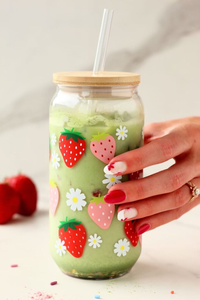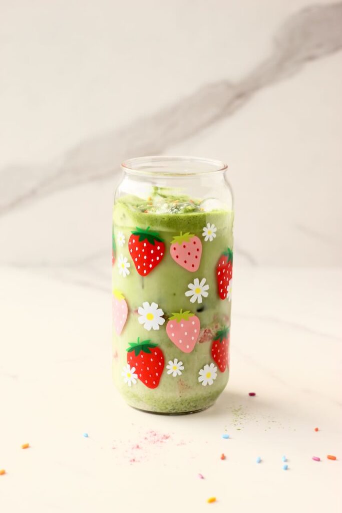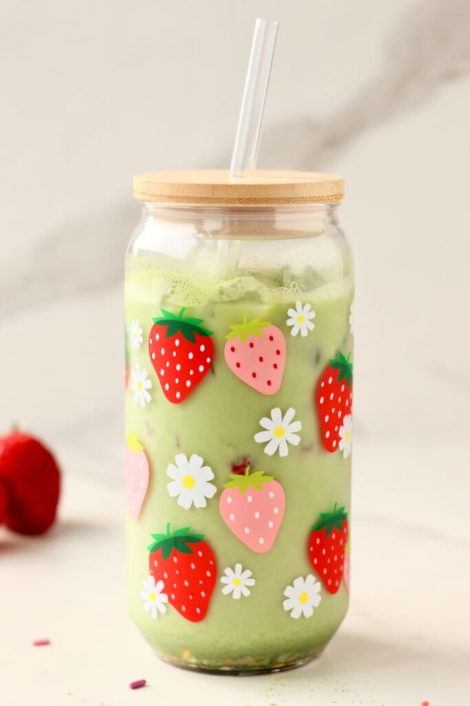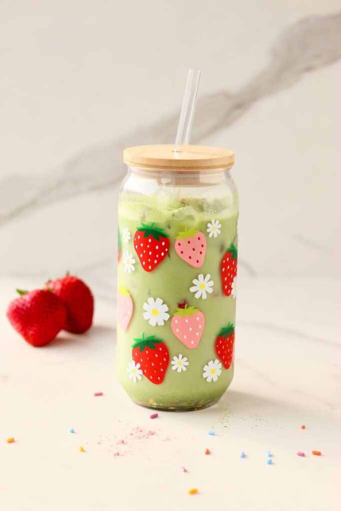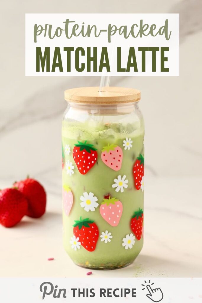 Protein Iced Matcha Latte in glass cup with strawberries on side