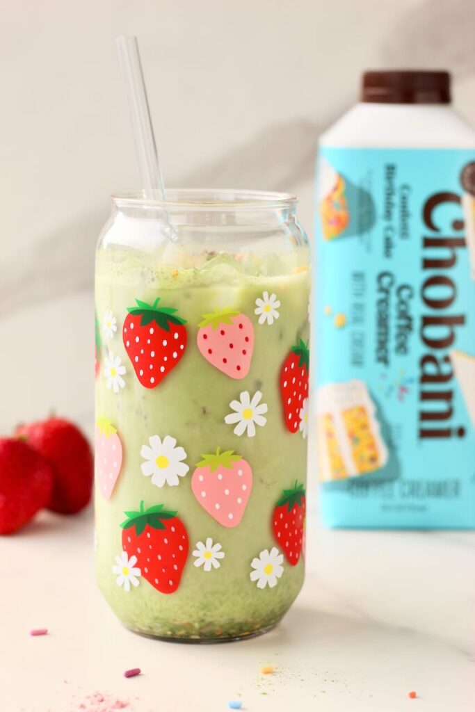 Protein Iced Matcha Latte in glass cup with Chobanai coffee creamer in background