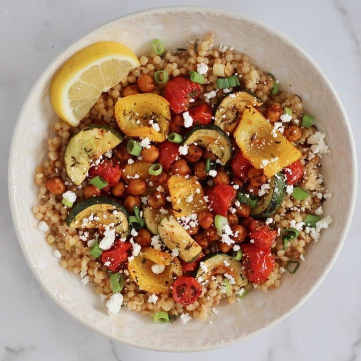 Look for a satisfying meatless meal pack with plant based protein? Try these Roasted Chickpea Couscous Bowls! This Mediterranean-inspired, vegetarian meal is made with Israeli couscous, colorful veggies, and crispy chickpeas.