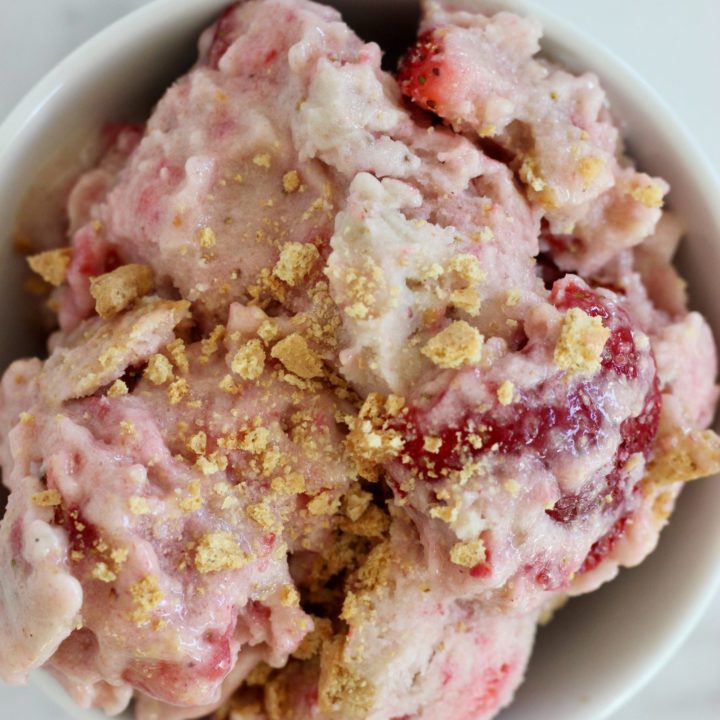 Strawberry Cheesecake Nice Cream is the perfect healthier recipe to fix your sweet craving. This dessert is naturally sweetened from fruit and takes just a few minutes to blend up.