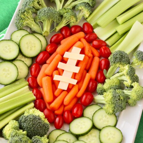 This Football Veggie Tray is perfect to make as a healthy option for game day! Plus, you can customize it to include your favorite veggies, chips, and dip.
